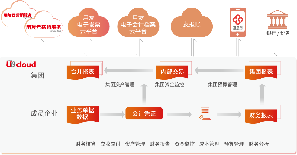U8 cloud財(cái)務(wù)管理應(yīng)用,滿足智能財(cái)務(wù)新模式,通過用友云與客戶、供應(yīng)商、服務(wù)商等產(chǎn)業(yè)鏈伙伴進(jìn)行實(shí)時(shí)交易和財(cái)務(wù)信息共享與傳遞,使多組織企業(yè)的智能化財(cái)務(wù)核算、財(cái)務(wù)管理與財(cái)務(wù)分析更高效。
