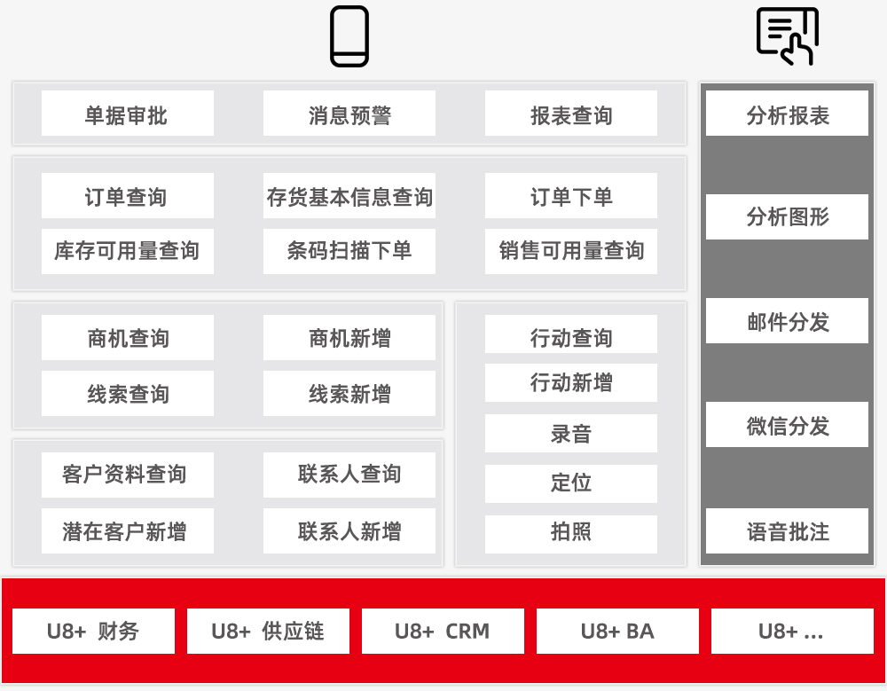 U8+支持企業(yè)實現(xiàn)商業(yè)軟件的多端(PC、手機(jī)、平板等多種設(shè)備)多系統(tǒng)(windows、iOS、Android等主流系統(tǒng))應(yīng)用部署,實現(xiàn)跨屏應(yīng)用,結(jié)合多種業(yè)務(wù)協(xié)作場景與業(yè)務(wù)處理流程,發(fā)揮移動設(shè)備便攜特性及互聯(lián)網(wǎng)廣域優(yōu)勢,全面提升企業(yè)對最前端客戶的消費行為、銷售經(jīng)理及團(tuán)隊的營銷行為和營銷通路的商業(yè)數(shù)據(jù)采集效率、關(guān)鍵營銷業(yè)務(wù)的審批與處理效率,對提升企業(yè)整體市場競爭力,快速洞察市場變化,提升市場響應(yīng)速度有巨大幫助。